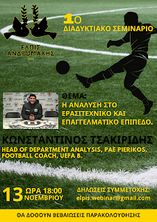 Η Ελπίς Ανδρομάχης, με κεντρικό άξονα την αγάπη για το ποδόσφαιρο και τη διάθεση όλων για συνεχή γνώση και βελτίωση, ακόμη και σε περιόδους κρίσης, βρίσκεται στην ευχάριστη θέση να ανακοινώσει την έναρξη του 1ου Διαδικτυακού Σεμιναρίου με θέμα: Η ανάλυση στο ερασιτεχνικό και επαγγελματικό επίπεδο, με εισηγητή τον κ. Τσακιρίδη Κωνσταντίνο, Διπλωματούχο Αναλυτή Ποδοσφαίρου της ΠΑΕ ΠΙΕΡΙΚΟΣ 1961.
