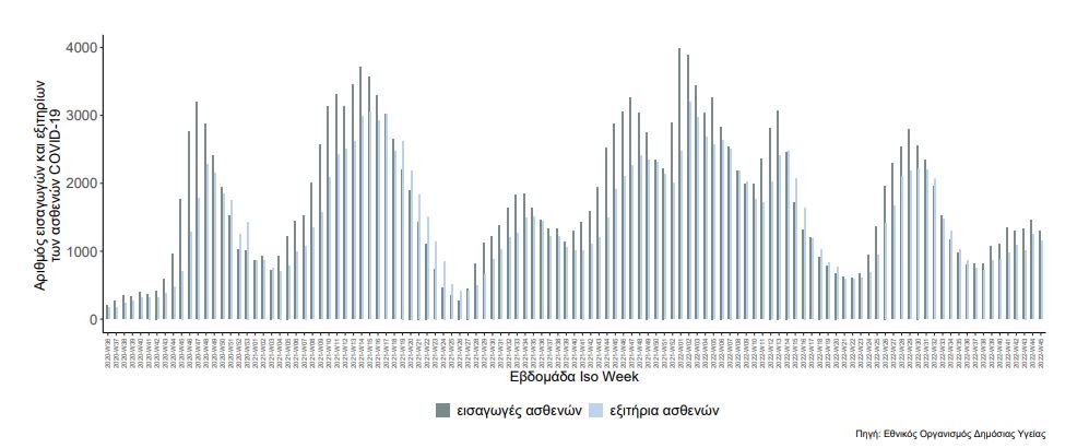 Το σύνολο των εισαγωγών, στα νοσοκομεία της επικράτειας, την εβδομάδα αναφοράς ήταν 1.292 ασθενείς (7μερος μ.ό.: 185, -11% εβδομαδιαία μεταβολή), ενώ το σύνολο των εξιτηρίων ανέρχεται σε 1.152 ασθενείς (7μερος μ.ο.: 165, -8% εβδομαδιαία μεταβολή). Ο αριθμός των ασθενών που νοσηλεύονται διασωληνωμένοι μέχρι τέλος της εβδομάδας αναφοράς είναι 81 (71.6% άνδρες) με διάμεση ηλικία 76 έτη και το 98.8% να έχει υποκείμενο νόσημα ή/και ηλικία 70 ετών και άνω.